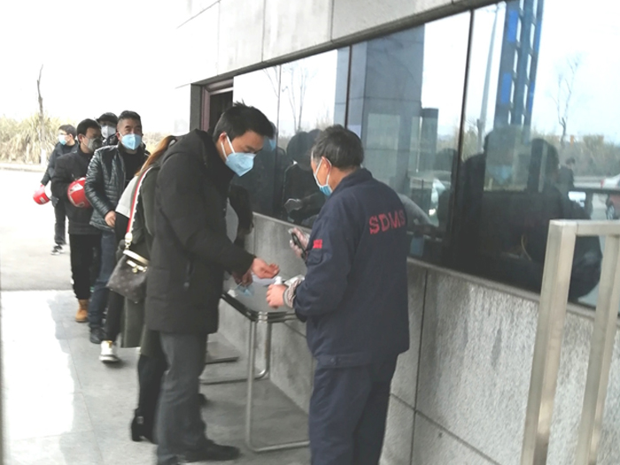 ??????復(fù)工首日始,全廠進(jìn)行全面消毒,所有員工依次排隊(duì)進(jìn)行體溫檢測(cè)、登記、消毒等、并再次每人發(fā)放口罩。
