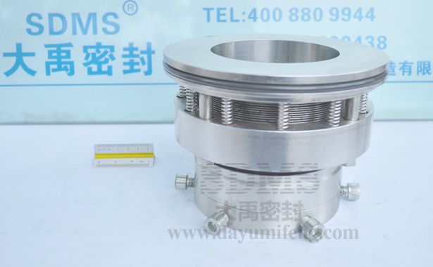 ? ? ? ?高壓加氫反應(yīng)釜用非集裝式機(jī)械密封。主體分為動(dòng)環(huán)和靜環(huán)組件。彈性補(bǔ)償結(jié)構(gòu)與靜環(huán)連接為一體形成靜環(huán)組件,安裝時(shí)需先將靜環(huán)組件安裝到反應(yīng)釜腔體上,調(diào)節(jié)動(dòng)環(huán)到要求的安裝位置上,擰緊緊定螺釘,使動(dòng)環(huán)與旋轉(zhuǎn)軸相對(duì)鎖死,并能穩(wěn)定的隨旋轉(zhuǎn)軸一起旋轉(zhuǎn)。高壓加氫反應(yīng)釜工作時(shí),通常溫度與壓力都較高,為了更好的起到密封效果,靜環(huán)的補(bǔ)償結(jié)構(gòu)采用了金屬波紋管配合均布的小彈簧共同提供補(bǔ)償力,充分保障機(jī)械密封在高壓環(huán)境下兩個(gè)密封環(huán)始終貼合在一起,達(dá)到穩(wěn)定的密封作用。